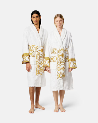 NWOT Versace I Heart Baroque Logo Jacquard Terry Bathrobe White/Gold Women's L