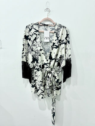 NWT Zara Floral Print Fringe Cuffs Kimono Wrap Jacket White Black Womens Sze M/L