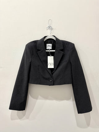 NWT Zara Crop Pinstripe Notched One-Button Blazer Dark Gray Women's Size Medium