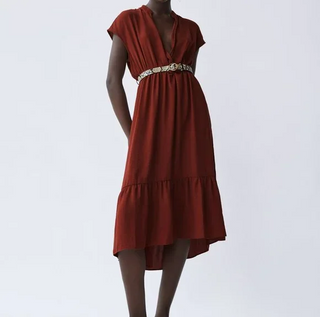 NWT Zara Cap Sleeve Belted Tiered A-Line Midi Dress Terracotta Womens Size Large