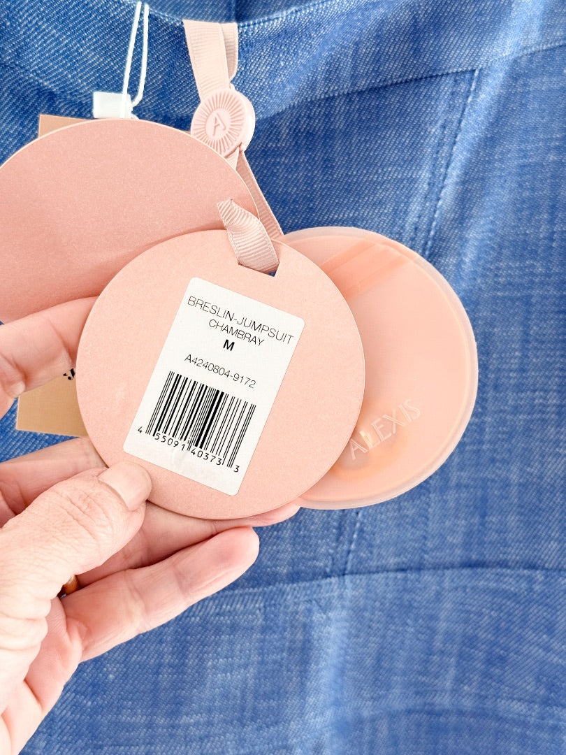Alexis Breslin denim jumpsuit, strapless straight leg jumpsuit, blue denim jumpsuit, stylish daytime outfit, contemporary denim jumpsuit, chic weekend wear, trendy strapless jumpsuit, modern casual jumpsuit, versatile denim outfit, fashion-forward jumpsuit, casual summer jumpsuit, Alexis clothing, sleek straight-leg jumpsuit