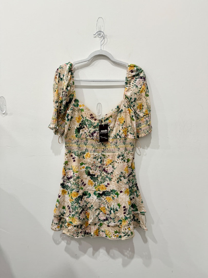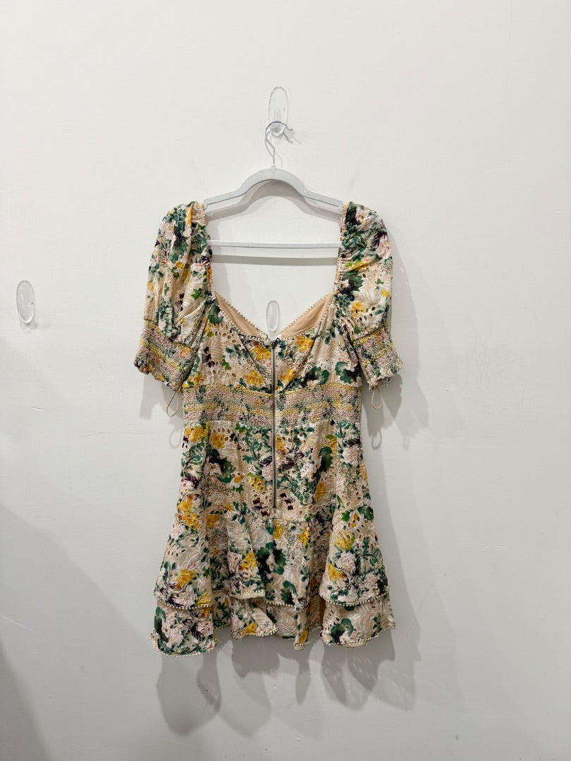 Alice & Olivia Crawford Sweetheart Tiered Floral Mini Dress Tan/Yellow/Green 12