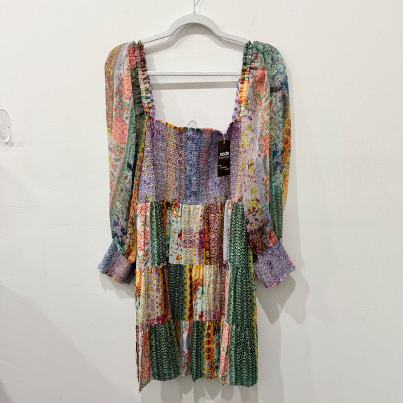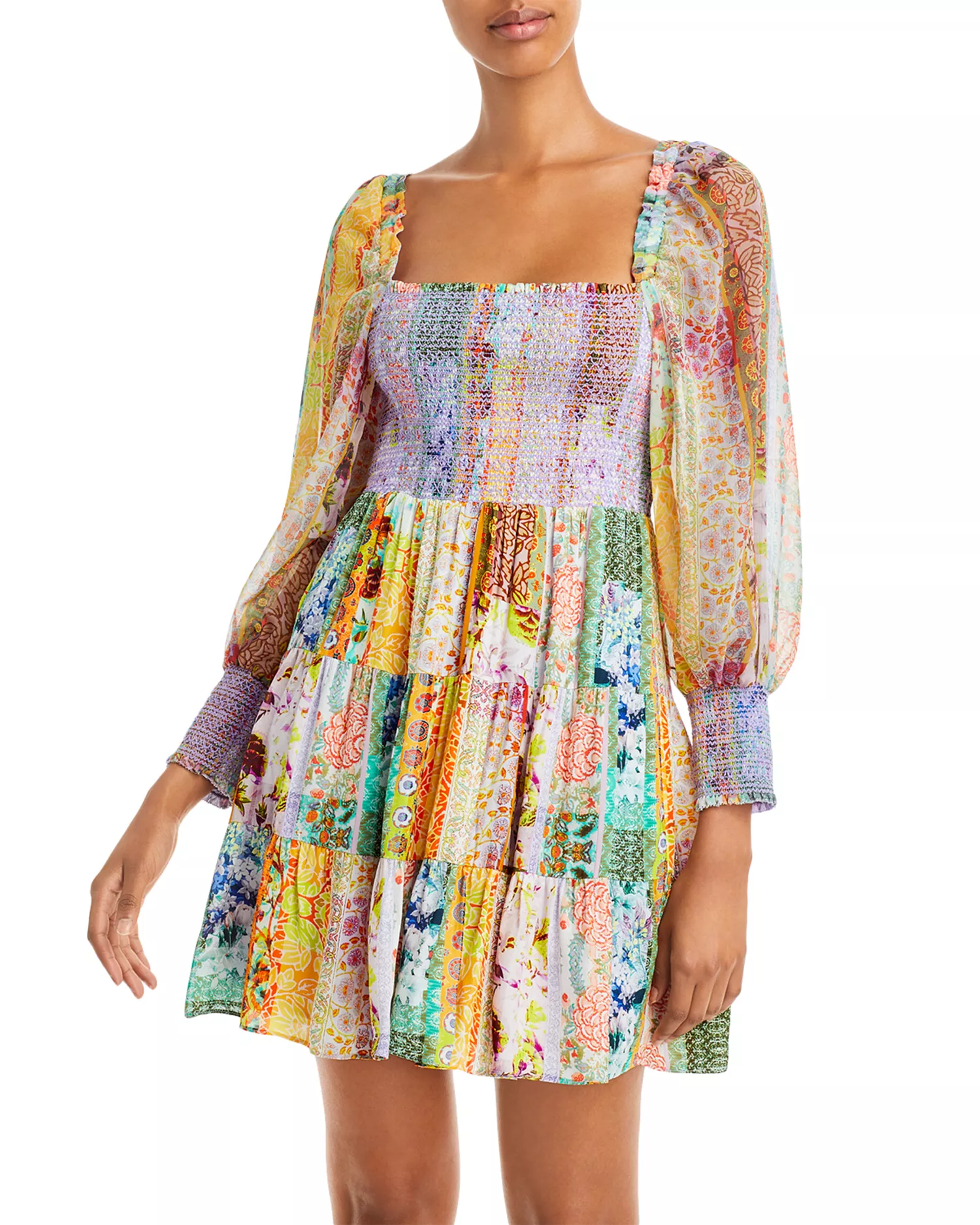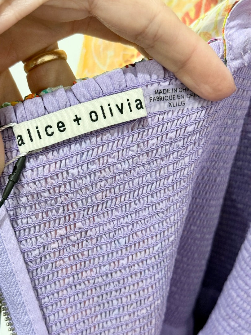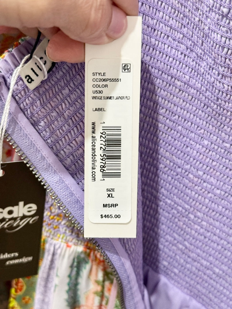 NWT Alice & Olivia Rowen Rowen Smocked Patchwork A-Line Dress Purple Multi XL