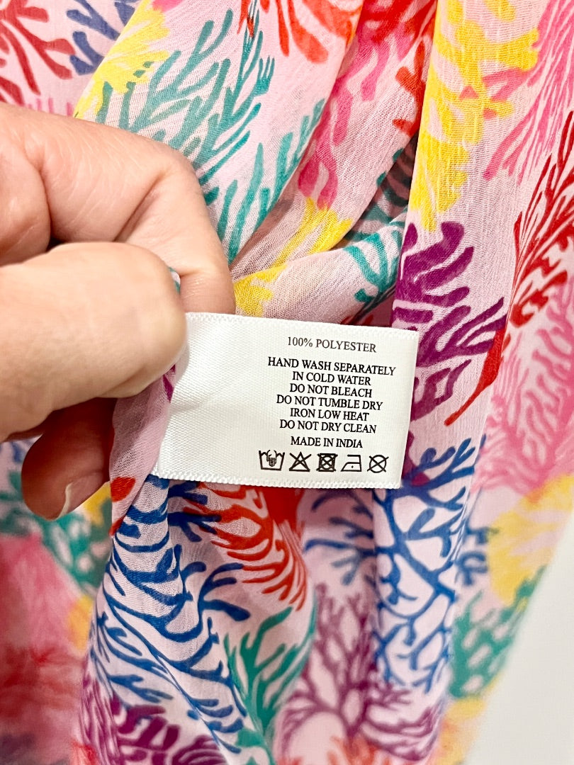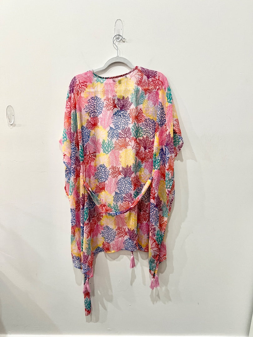 This vibrant and airy cover-up featuring a playful coral and sea-inspired print in mauve tones, lightweight fabric, and relaxed silhouette perfect for layering over swimwear or summer outfits.