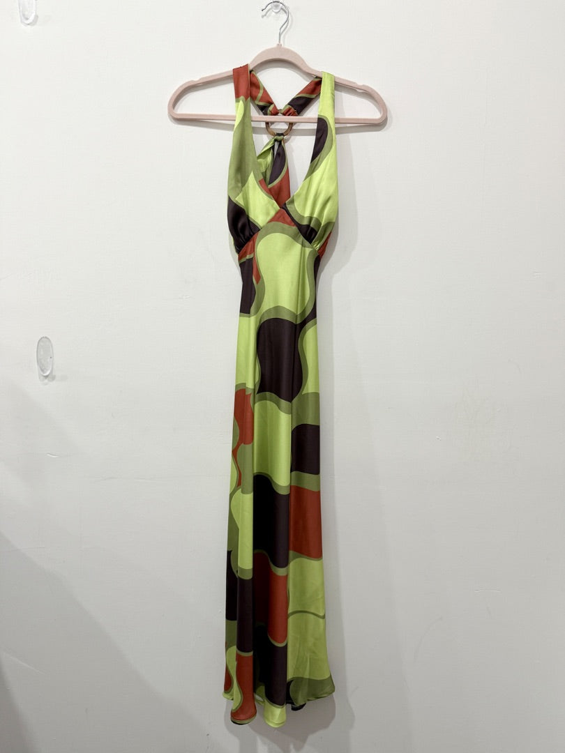 NWT Another Girl Satin Circle Trim Halter Midi Slip Dress Green/Brown Women's 6