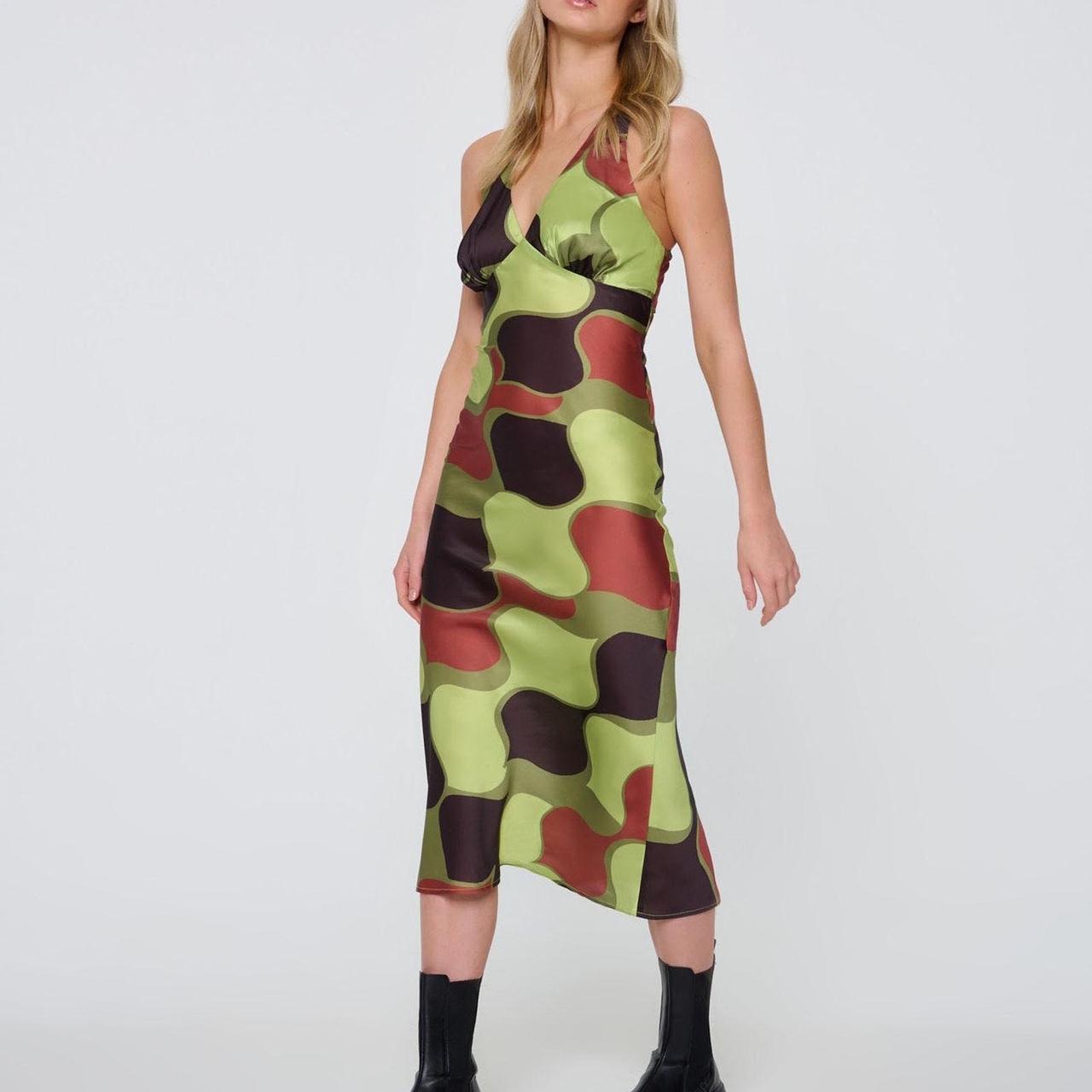 Crafted from smooth satin in a green and brown color palette, this dress is perfect for special occasions, parties, or elegant evenings out.