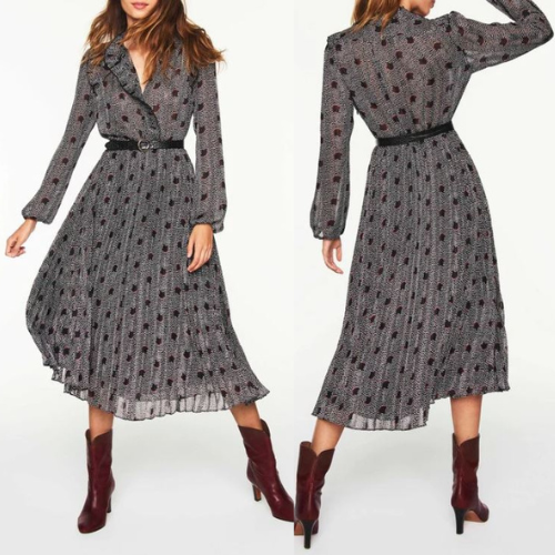 This flowy bluenight midi dress shimmers with metallic pleats, blending Parisian elegance and modern glamour for an effortlessly refined silhouette.