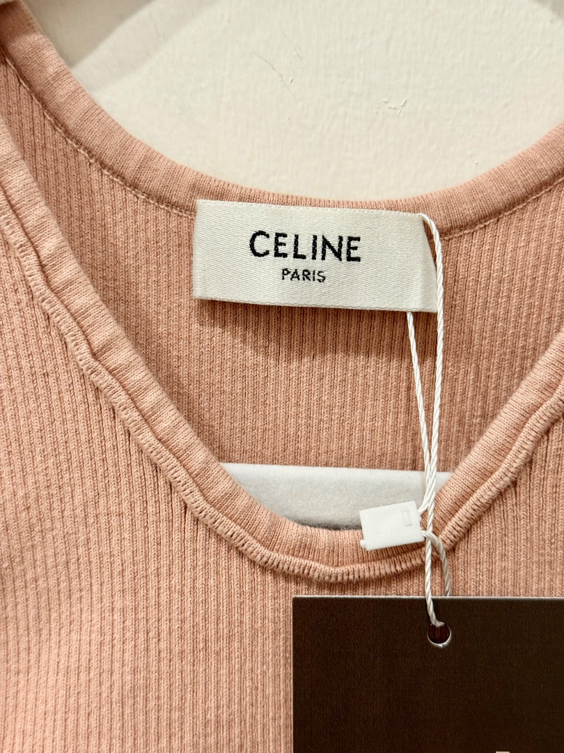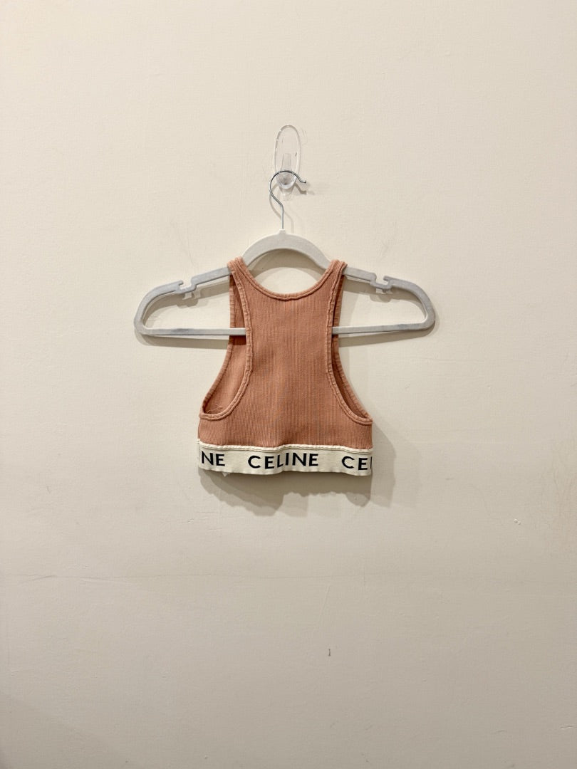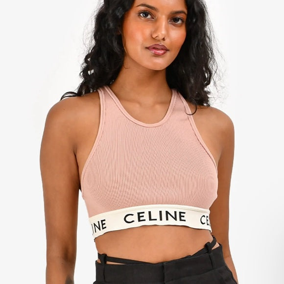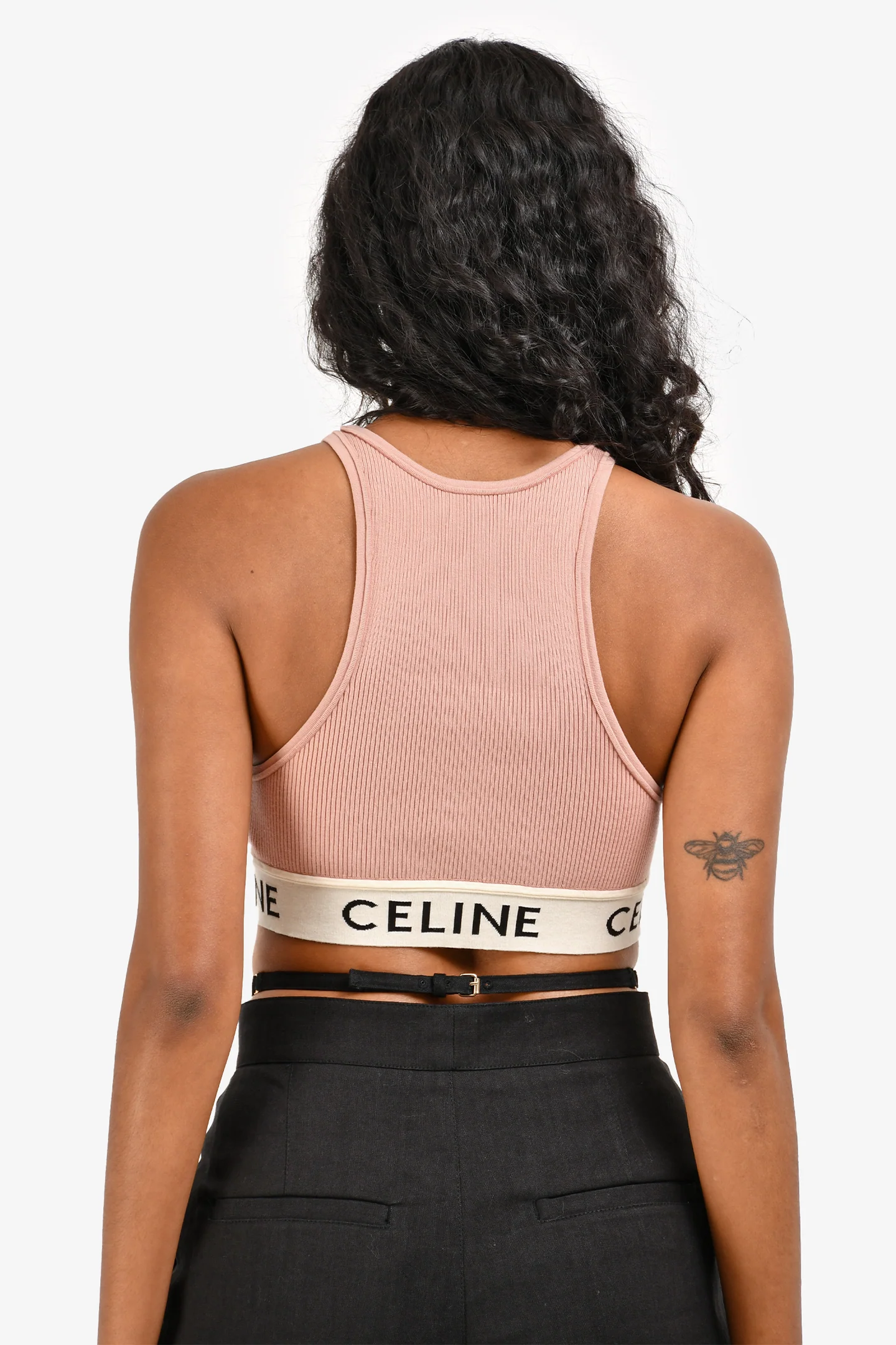 Celine Ribbed Logo Print Racerback Cropped Sports Bra Blush Pink Women's Size XS