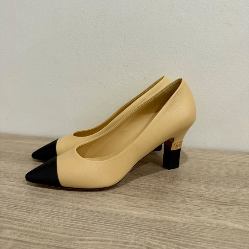 NWOT Chanel Two-Tone Leather Cap Toe Interlocking CC Pumps Beige/Black EU 37.5