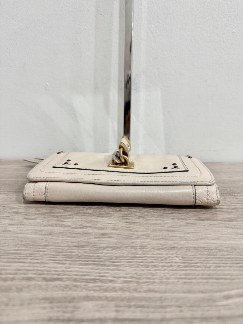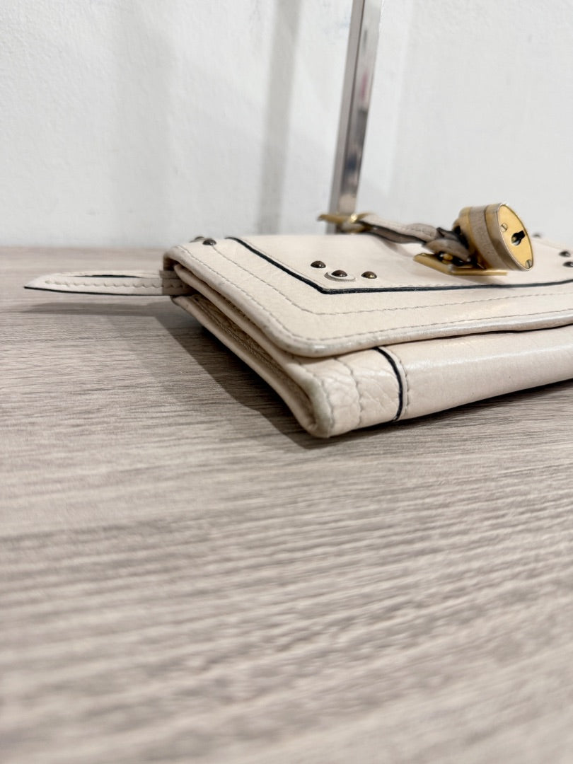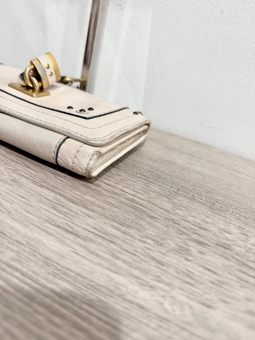 moderately used fair to good condition 7/10. has leather softening, scratches, discoloration and and tarnish on harware, corner wear and soiling.