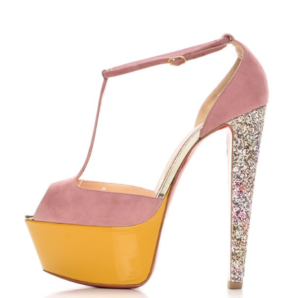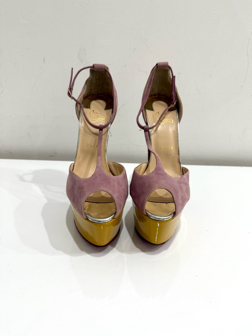 Stunning Christian Louboutin size 40 pink suede platform heels feature a bold yellow base, glitter stiletto heel, signature red sole, and elegant ankle strap — the ultimate statement shoe for any luxury wardrobe.