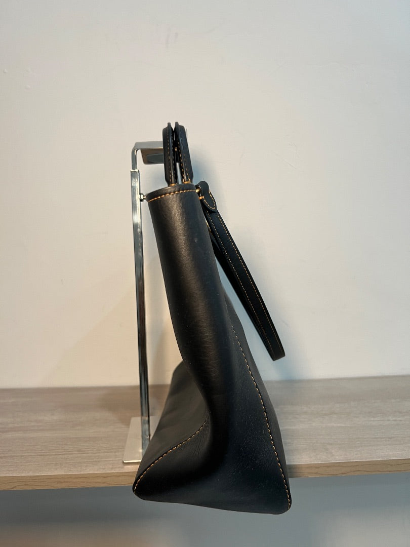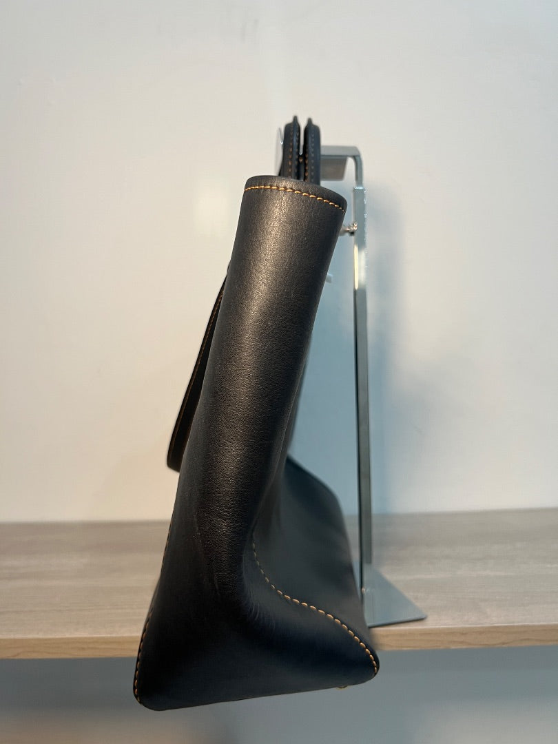 Fair condition, staining on interior (see pictures) Width at bottom 12.5” Height 11.5“ Depth 5“ Strap length 22“