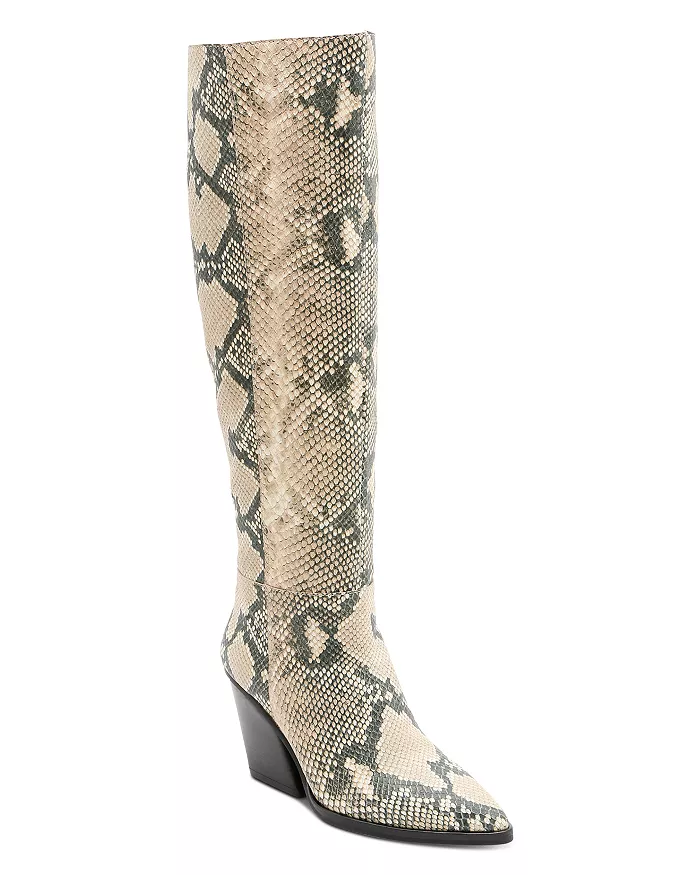 Turn heads with the Dolce Vita Isobel Snake Print Leather Heeled Knee-High Boots in beige. Perfect for pairing with skirts, dresses, or slim trousers for a statement-making look.