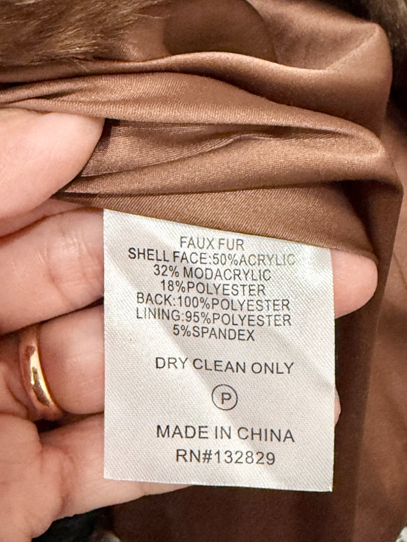 Faux Fur: 50% Acrylic, 32% Modacrylic, 18% Polyester
