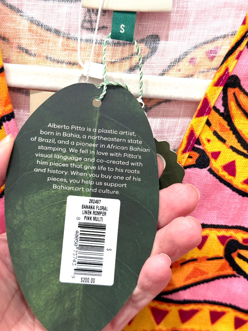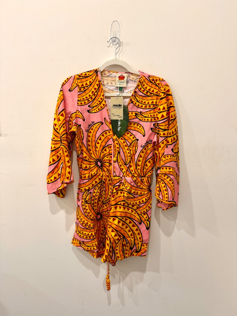 This Farm Rio romper features a vibrant banana floral print on lightweight linen with 3/4 sleeves, creating a playful and breezy look perfect for summer outings.