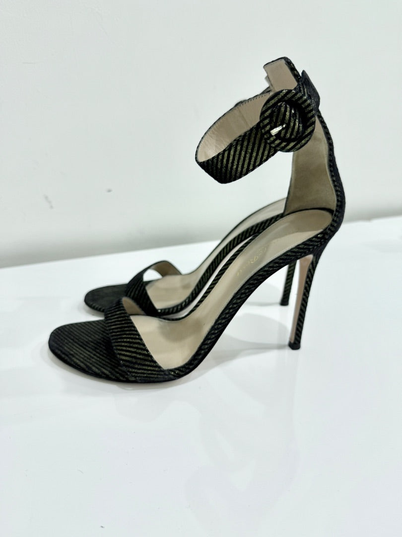 Gianvito Rossi Portofino Metallic Striped Open Toe Pump Heels Black Women's 39