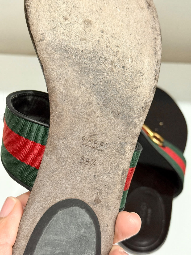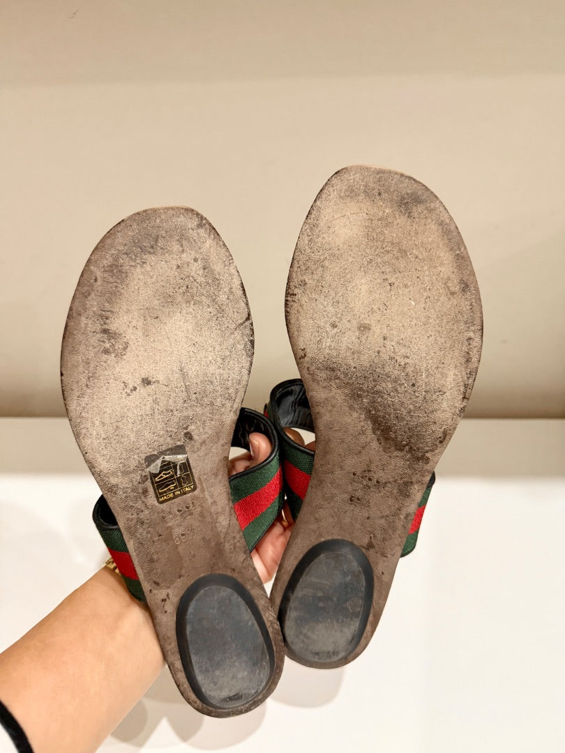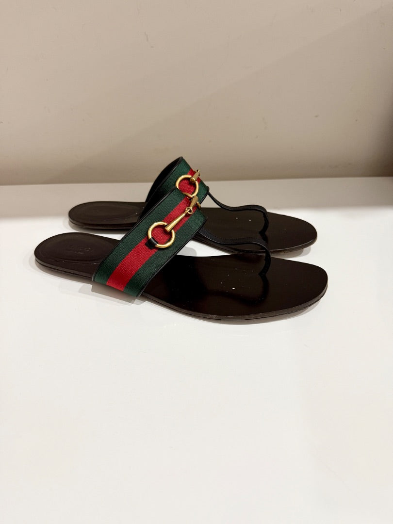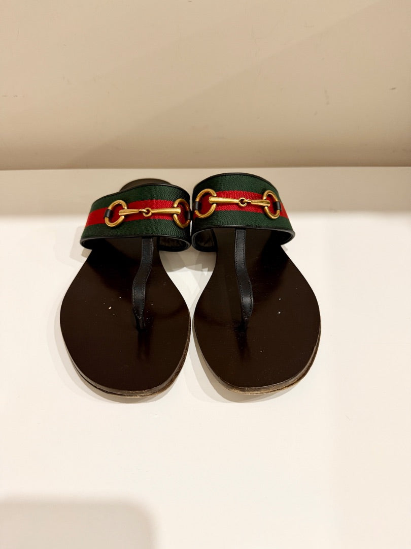 Gucci Querelle Leather/Canvas Horsebit Flat Thong Sandals Black Women's EU 39.5