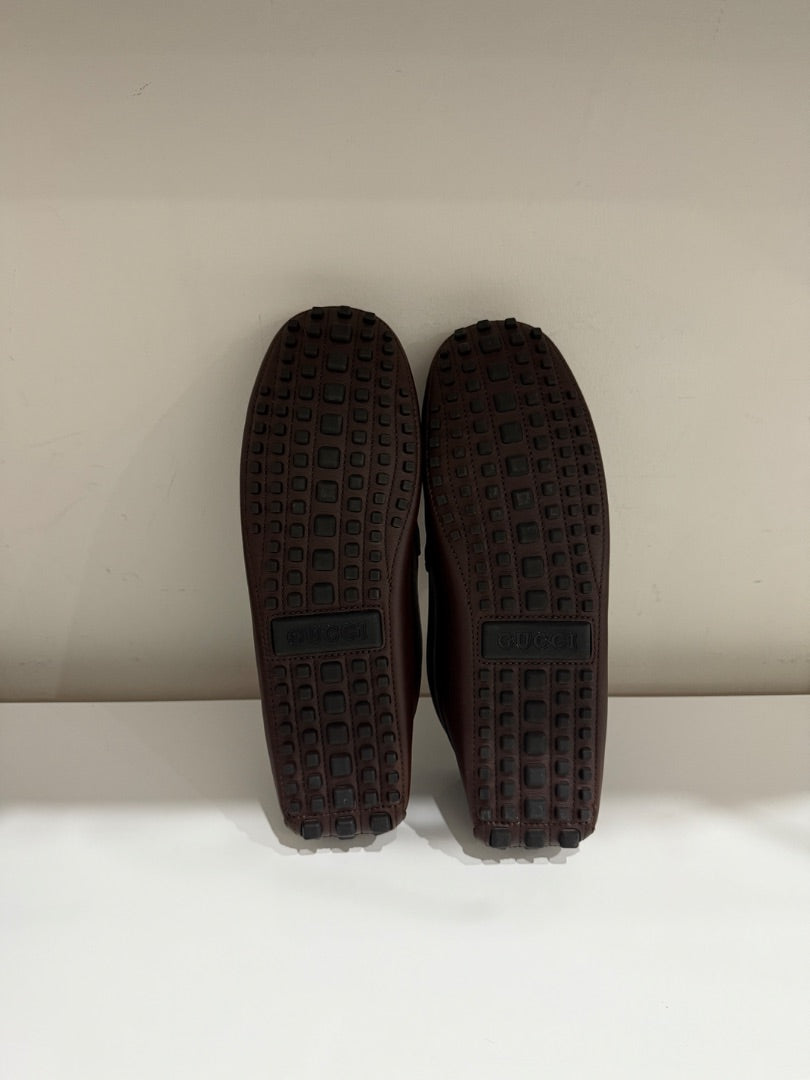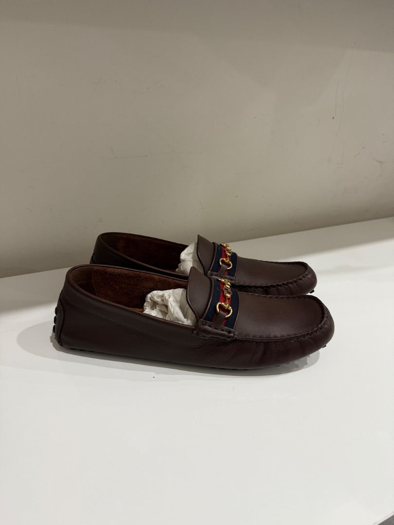 NWOT Gucci Ayrton Webbing-Trim Horsebit Leather Driving Loafers Brown Mens US 12