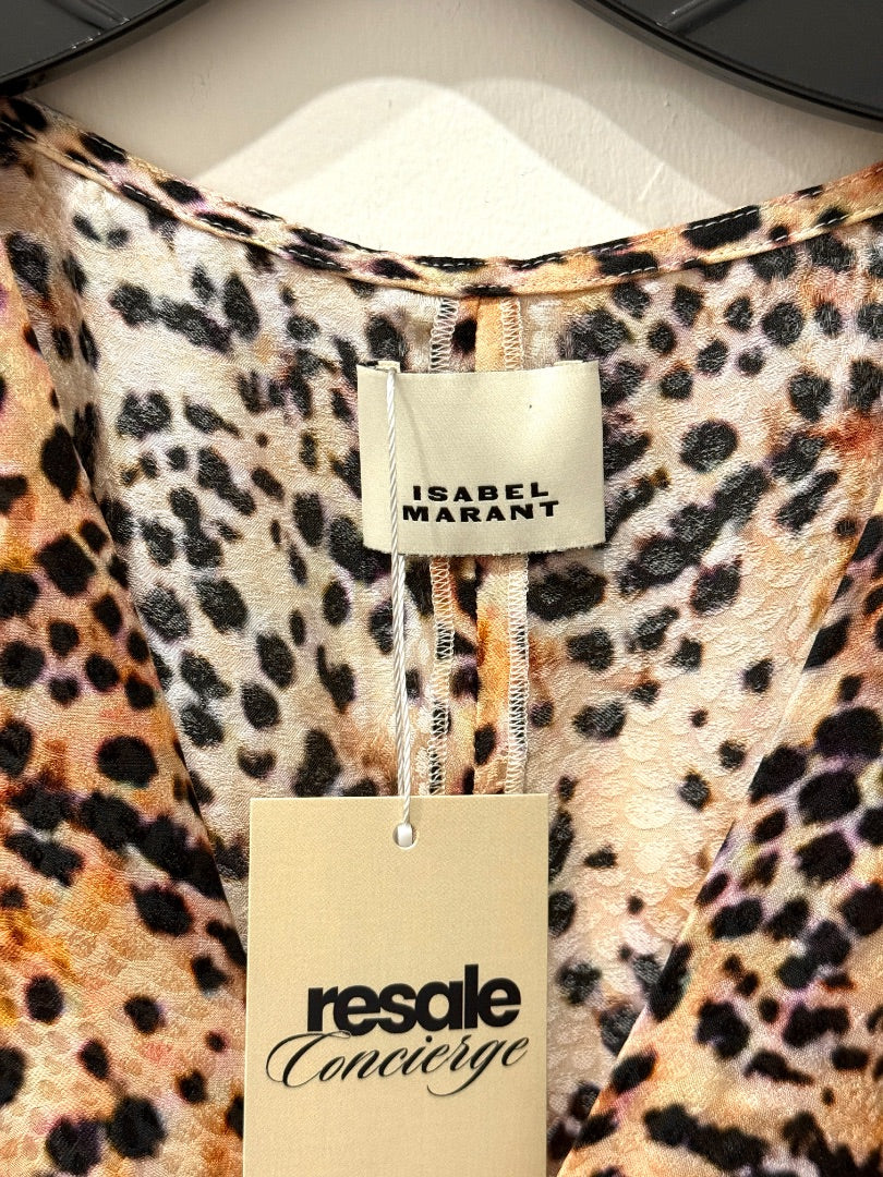 This lightweight blouse features a chic animal print with flutter sleeves and a flattering V-neckline, embodying Isabel Marant’s effortless bohemian style.