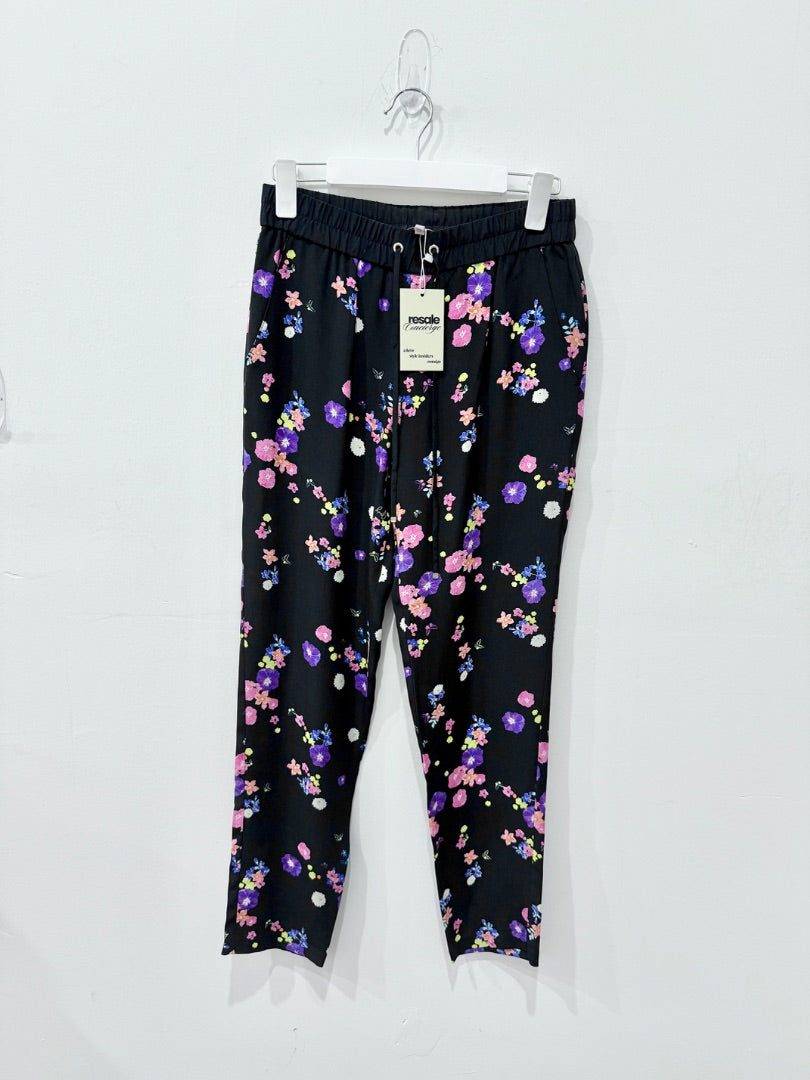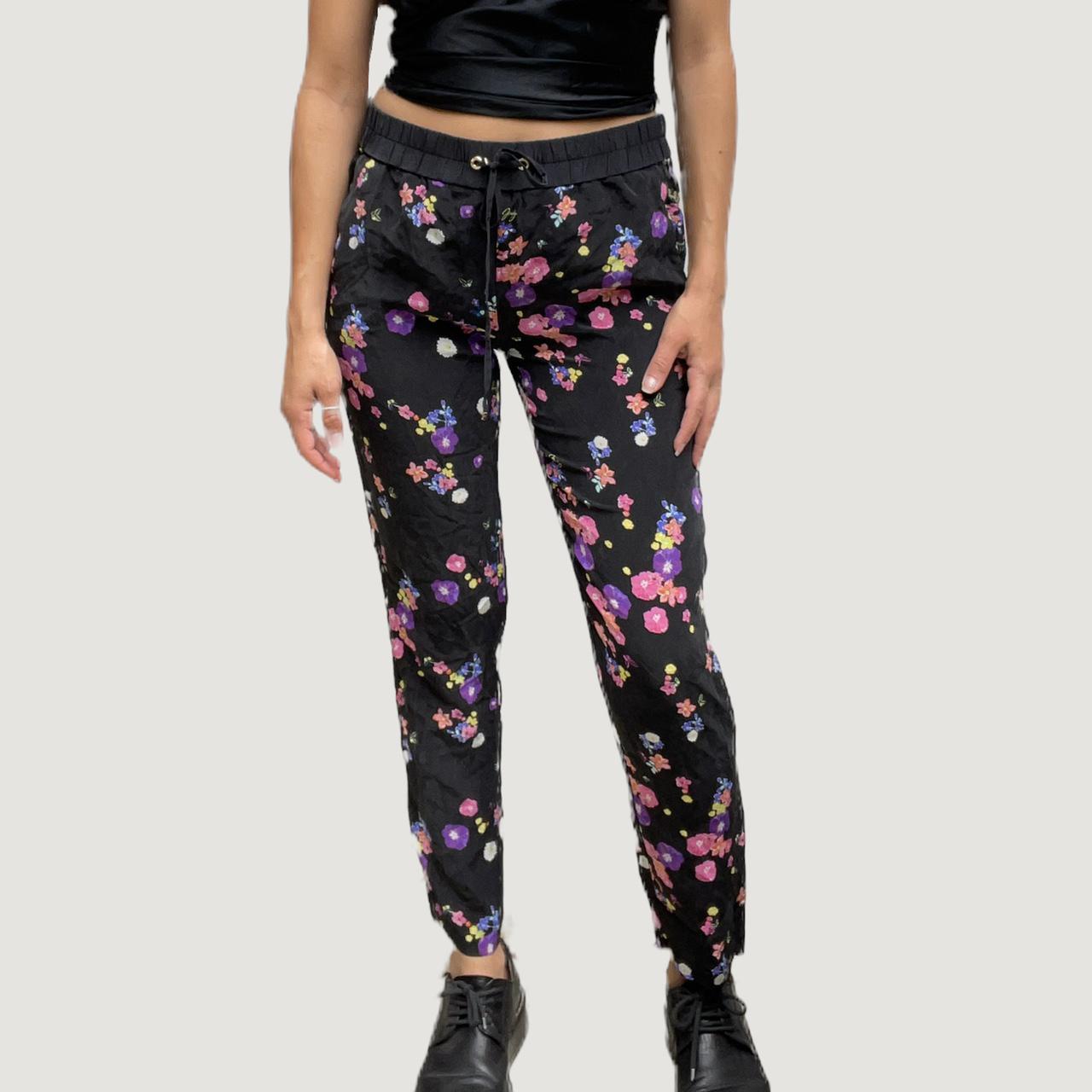 Luxurious slim silk joggers in black adorned with vibrant floral prints, combining relaxed comfort with eye-catching, feminine style.