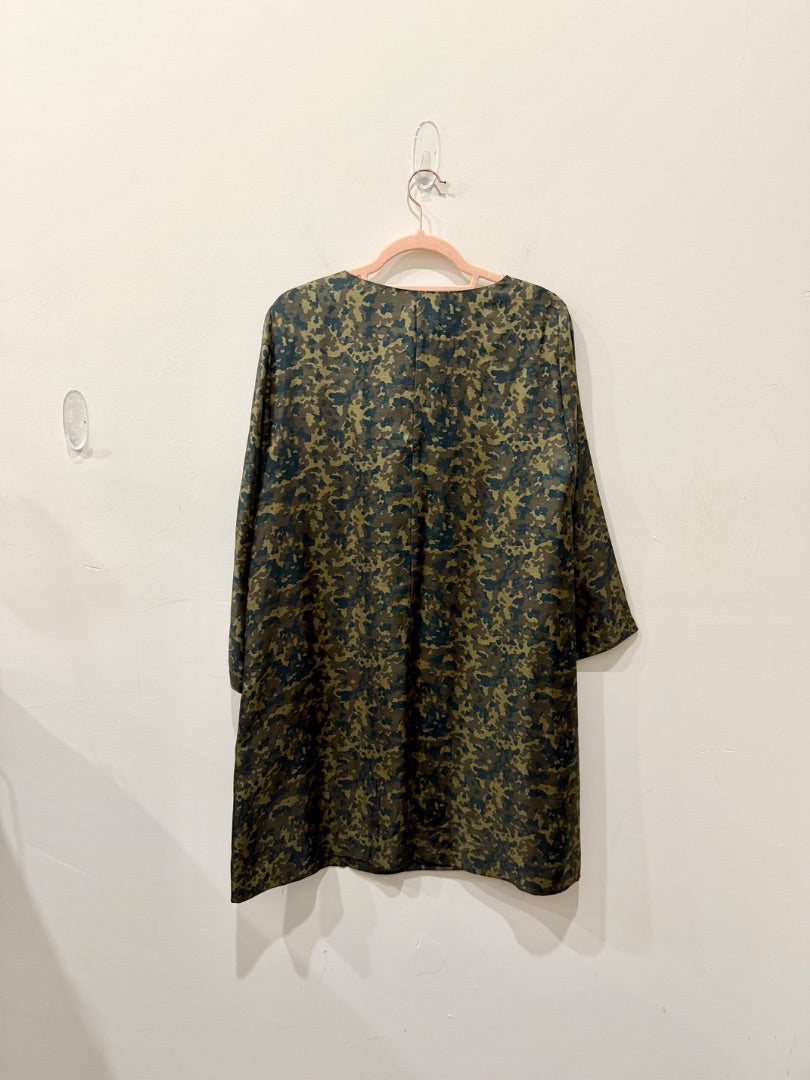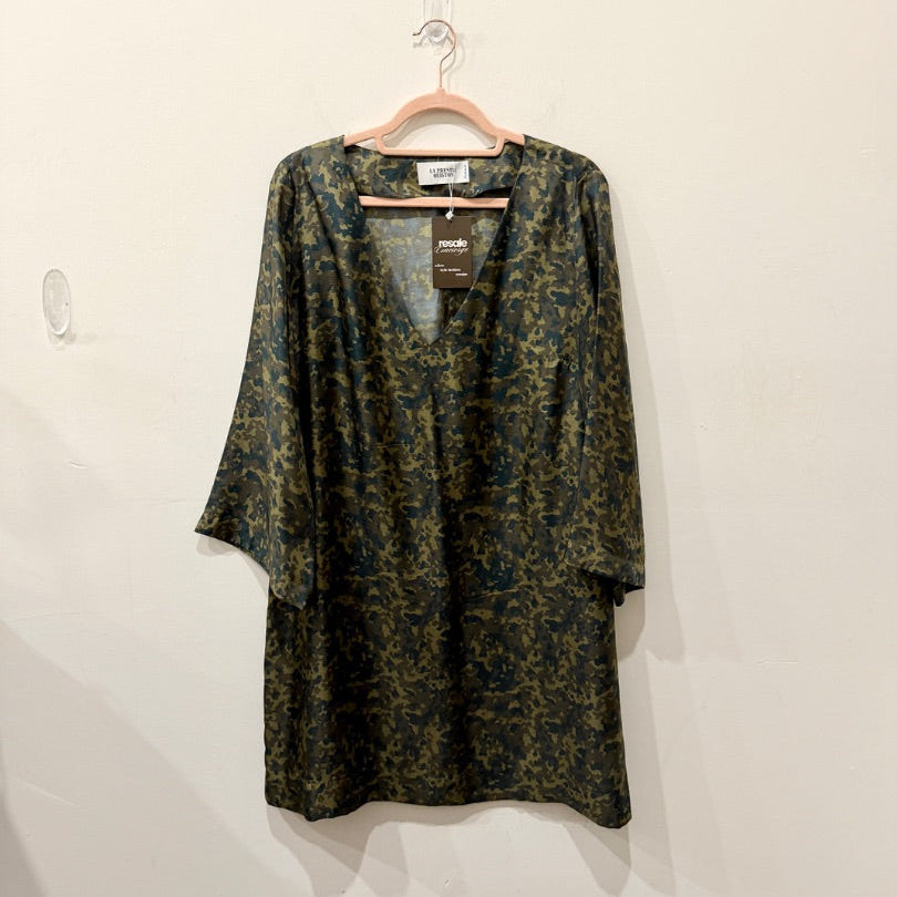 La Prestic Ouiston 100% Silk V-Neck Camo Print Mini Dress Green Women's 3 / L
