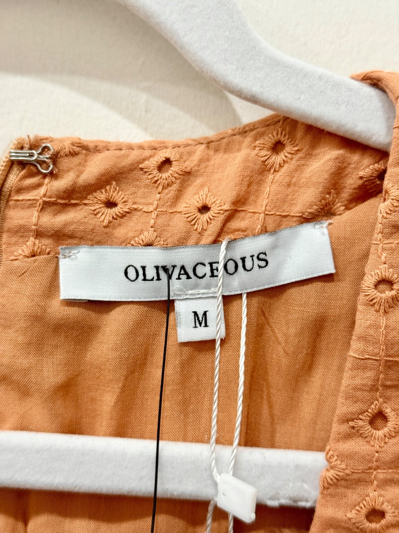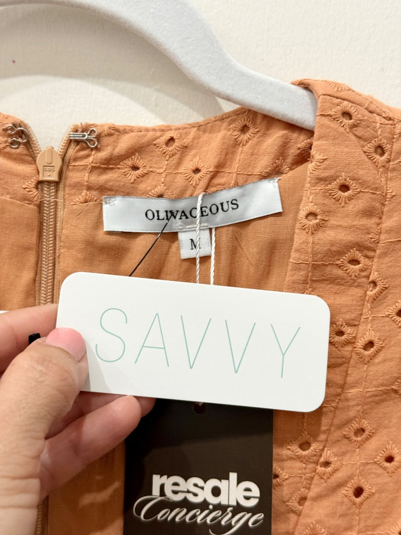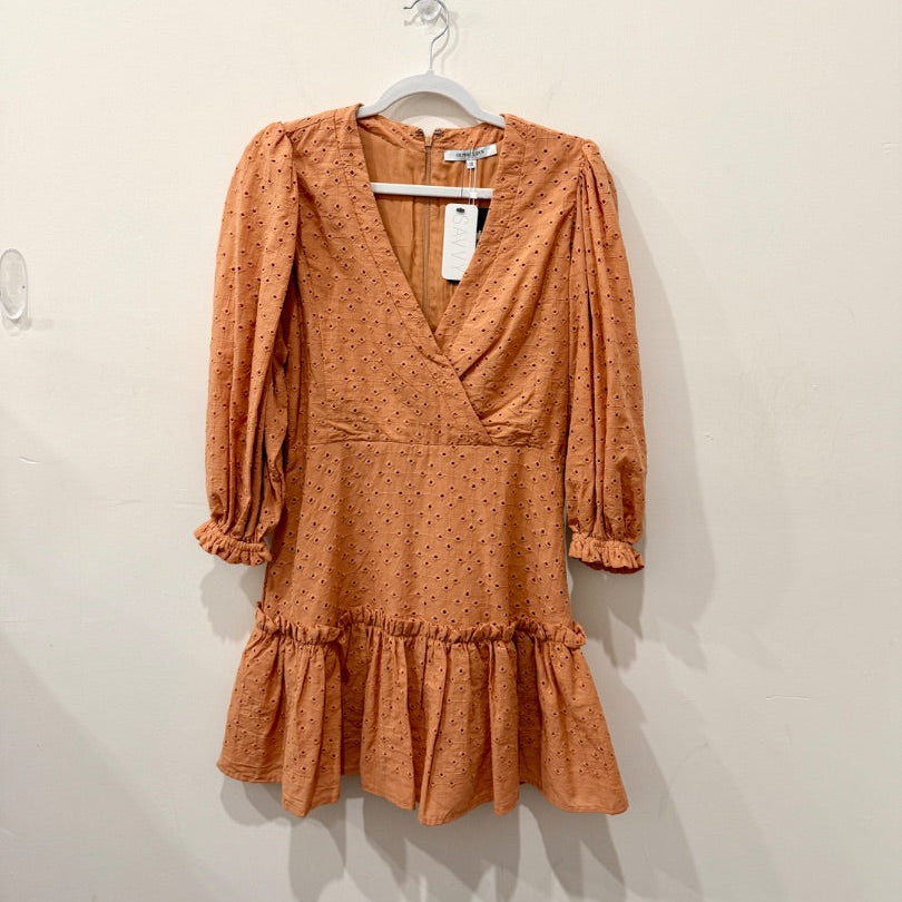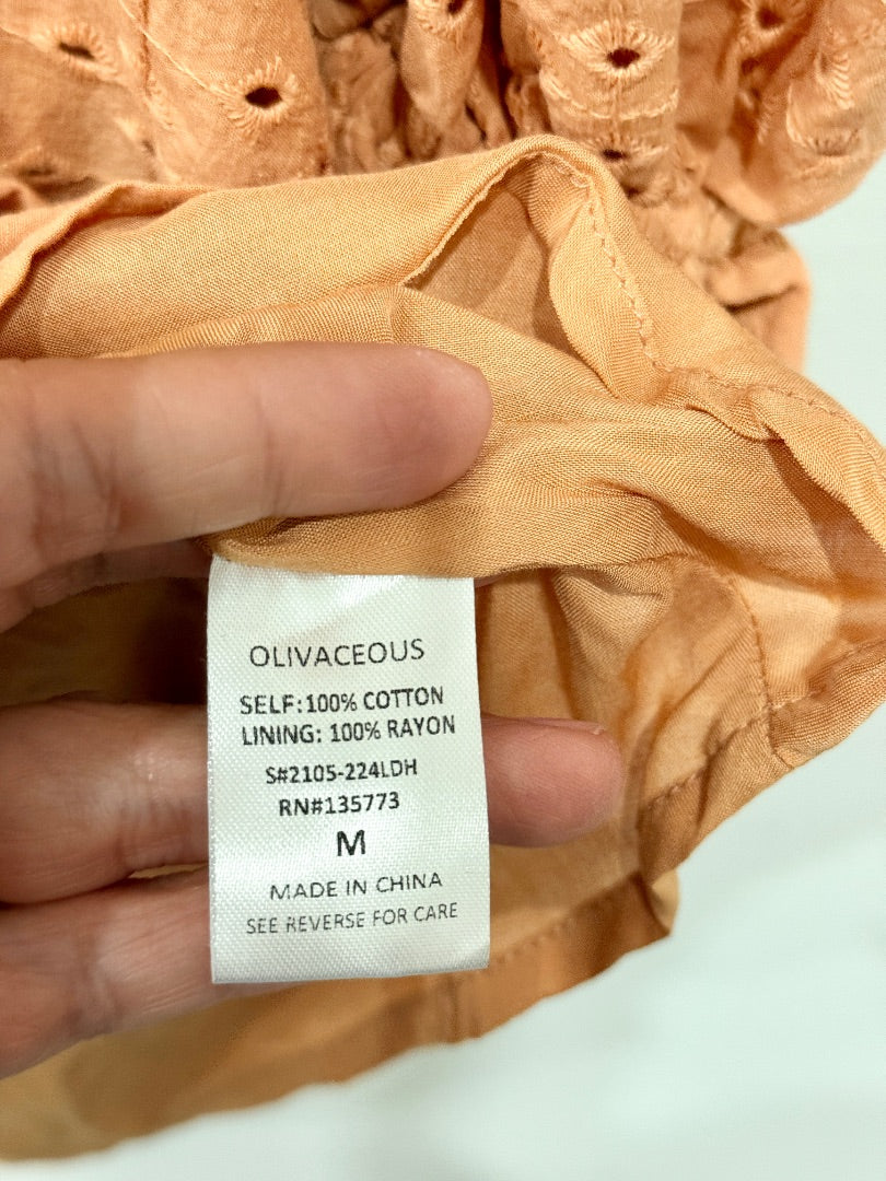 NWT Olivaceous Eyelet Puff Sleeve V-Neck Ruffle Hem Mini Dress Orange Women's M