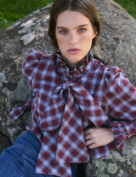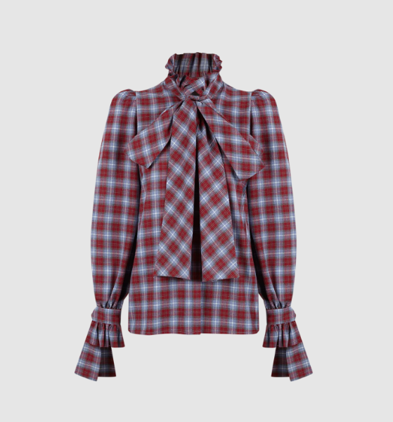 Paris 64 Louise Check Long Sleeve Ruffle Shirt Red/Blue/Beige Women's Size S