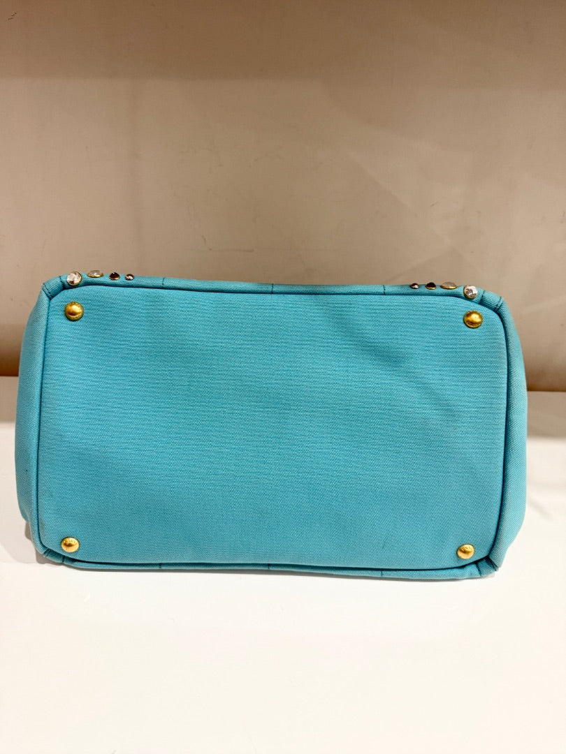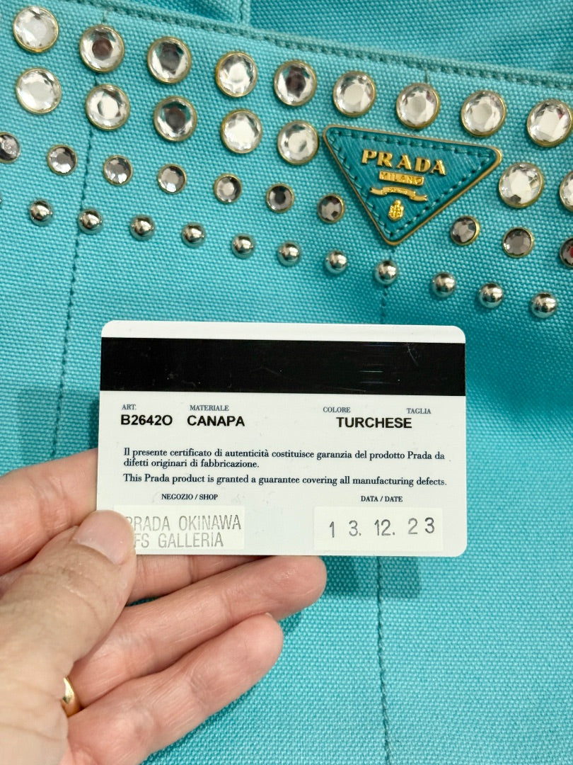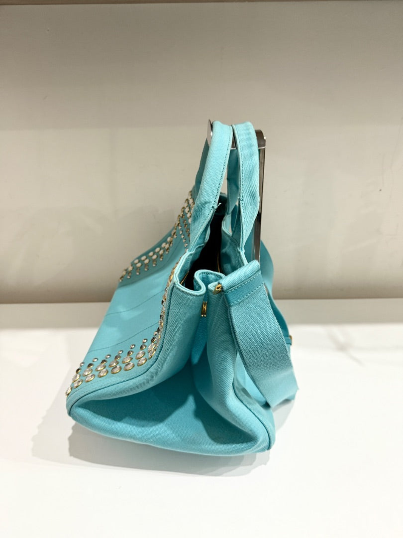 PRADA Canapa Bijoux Crystal Studded Shoulder Tote Handbag Turquoise