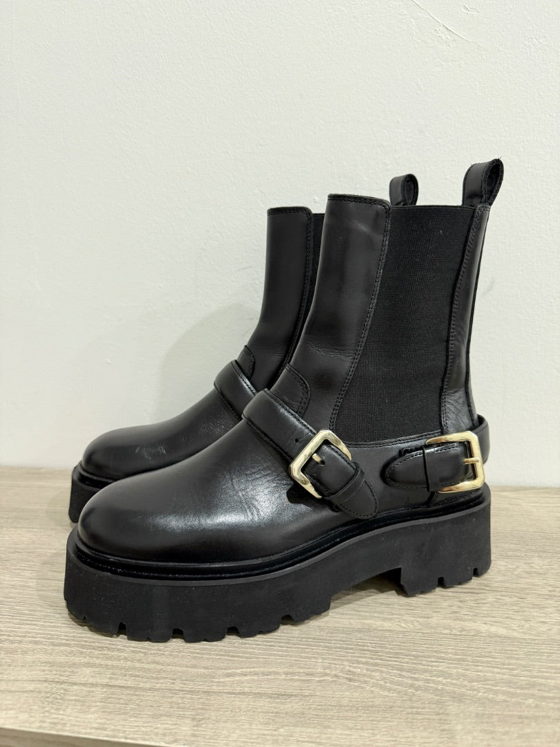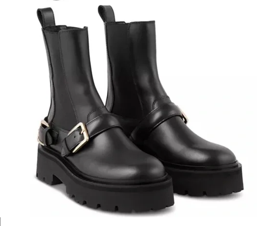 These modern Chelsea boots feature a sleek black design with bold buckle detailing and chunky soles, blending classic style with contemporary edge.