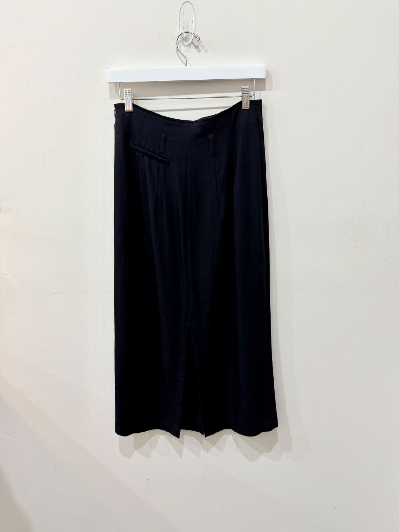 Sartorie Riunite high waisted black maxi skirt featuring sleek slit detailing for a modern, elegant look. This versatile piece is perfect for both formal occasions and elevated everyday style.