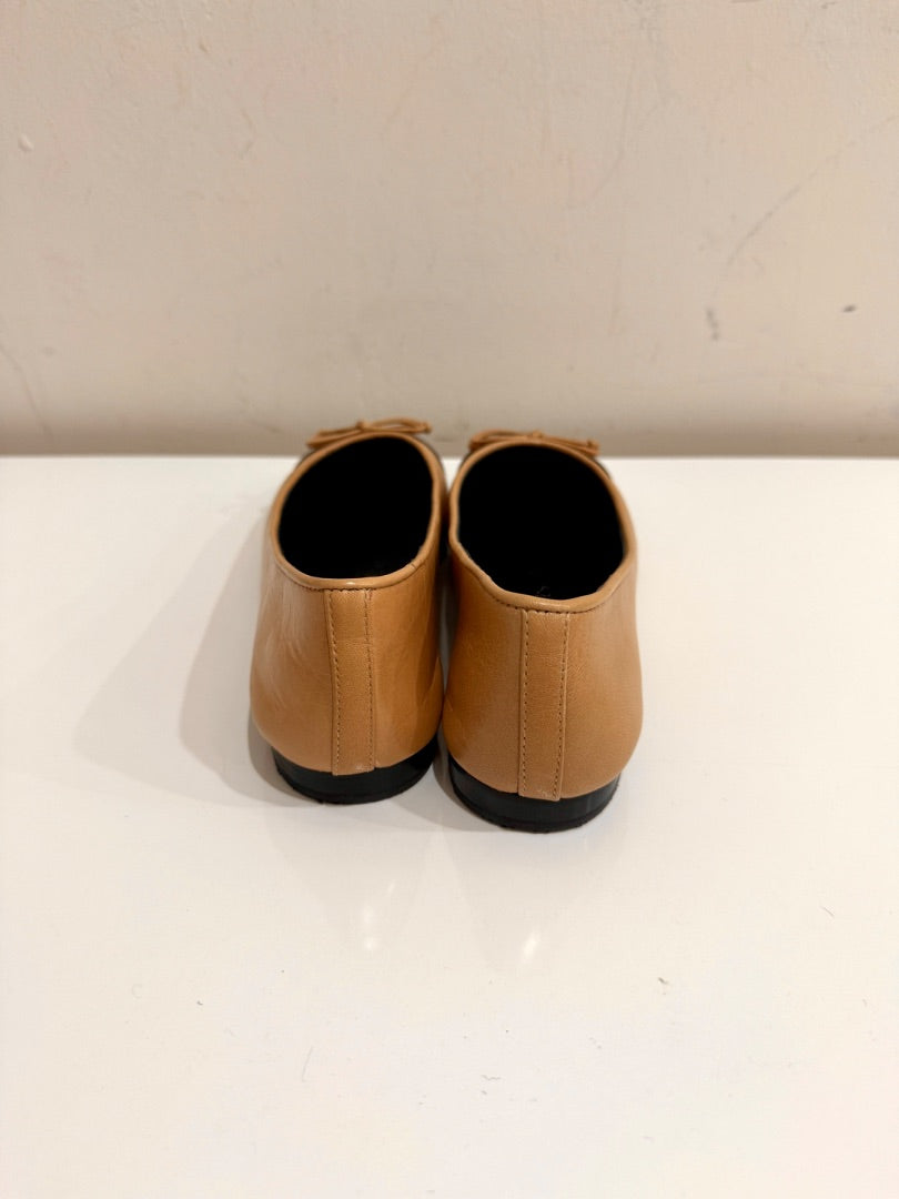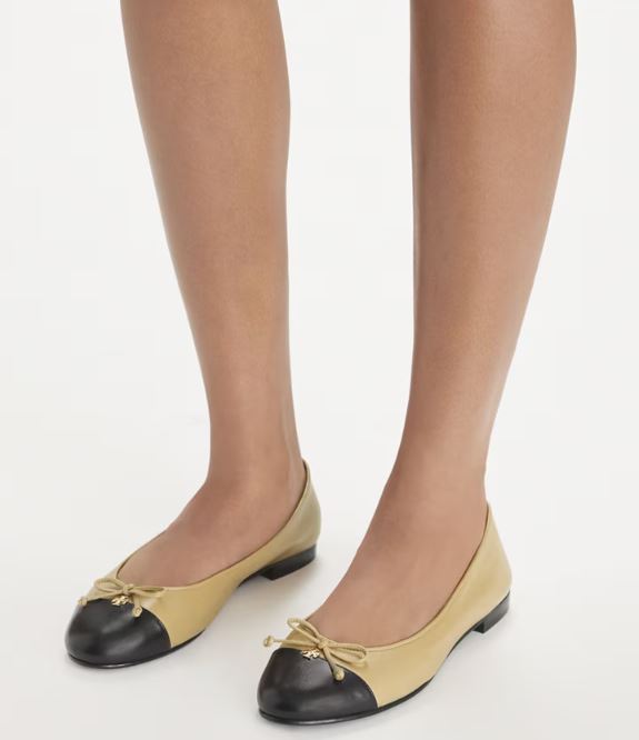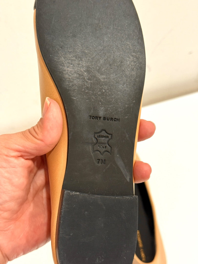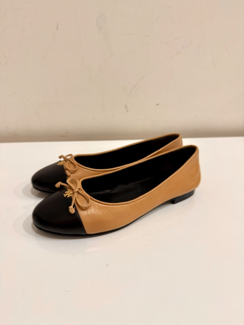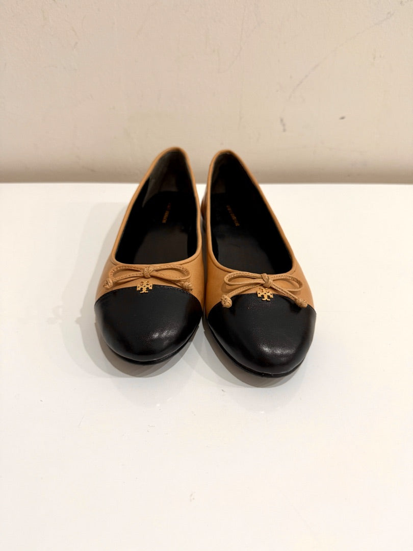 Tory Burch Nappa Leather Bow Cap-Toe Ballet Flats Ginger Black Women's Size US 7