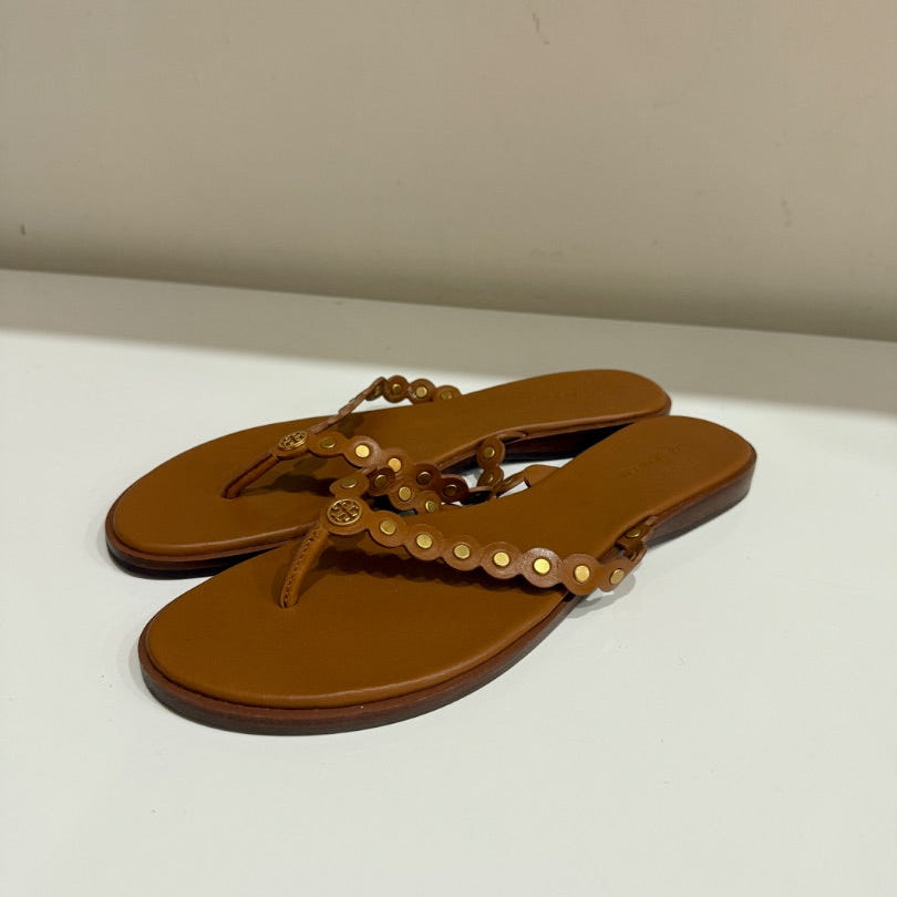 NWT Tory Burch Benton Scalloped Slip On Flat Thong Sandals Brown Womens Size 9.5