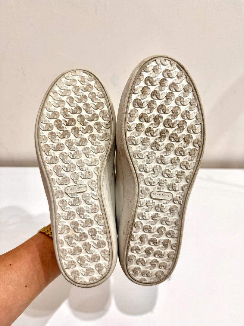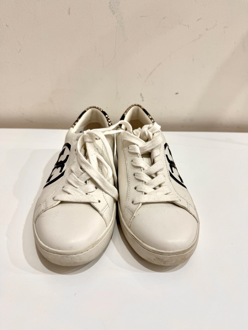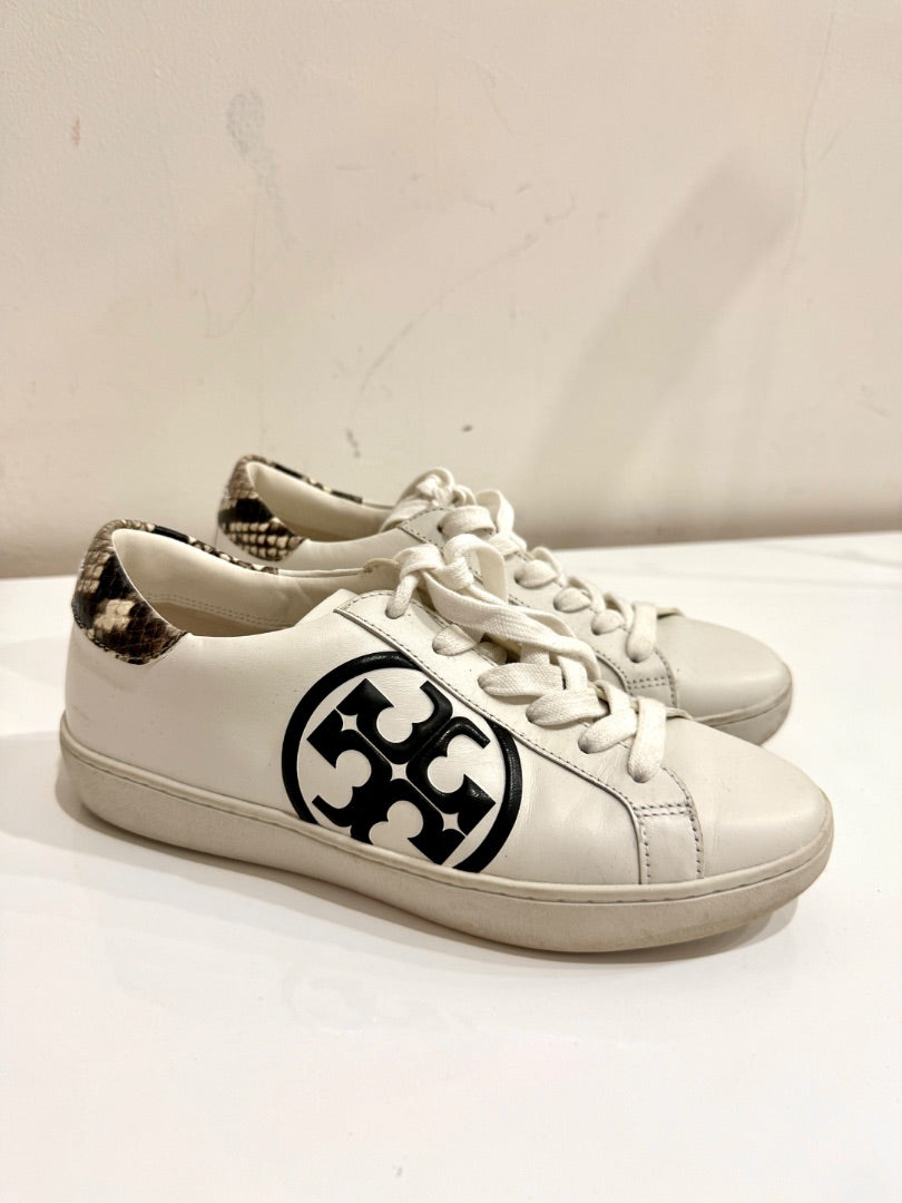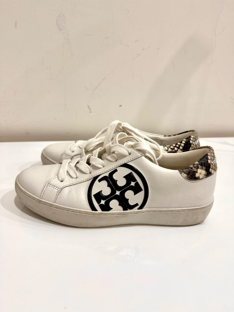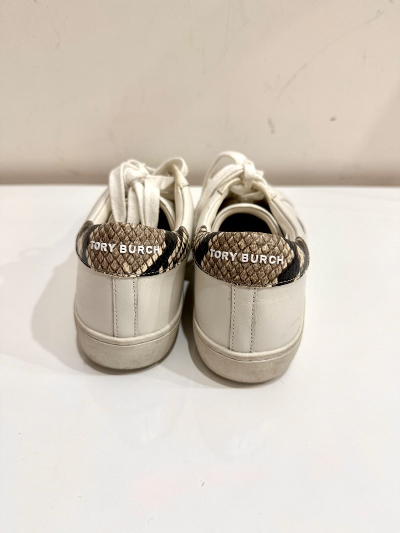 Tory Burch Leigh T-Logo Leather w/ Stamped Snake Print Court Sneakers White 6