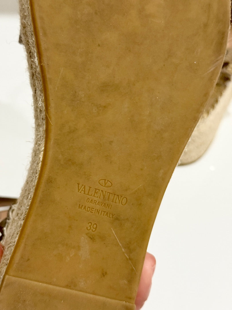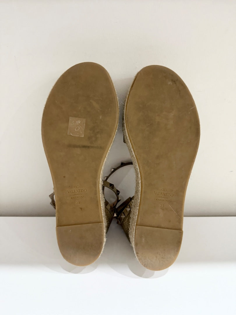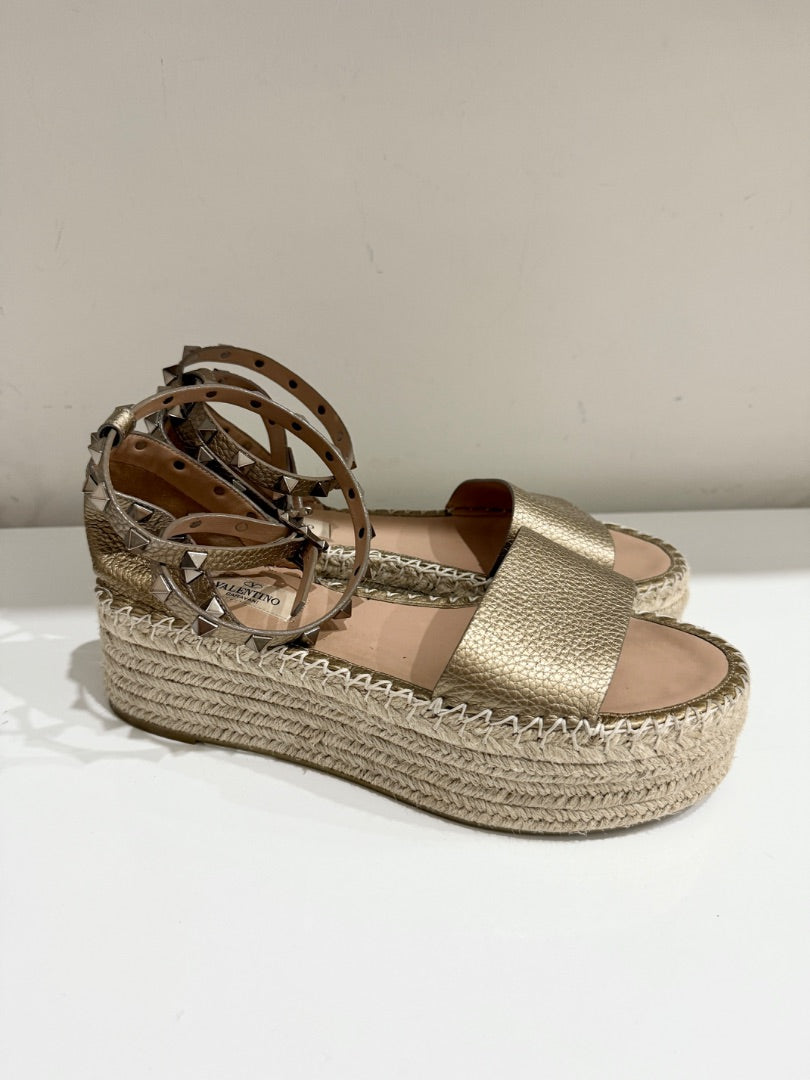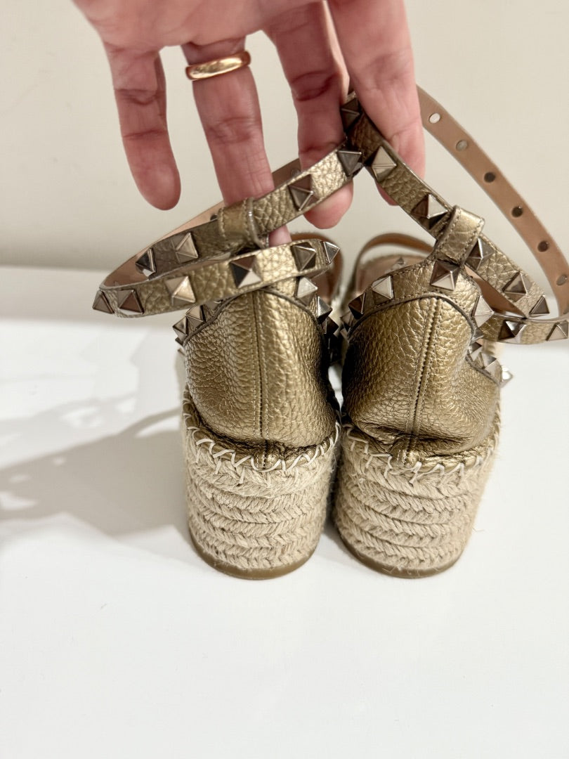 Valentino Rockstud Metallic Leather Platform Espadrille Sandals Gold Women EU 39