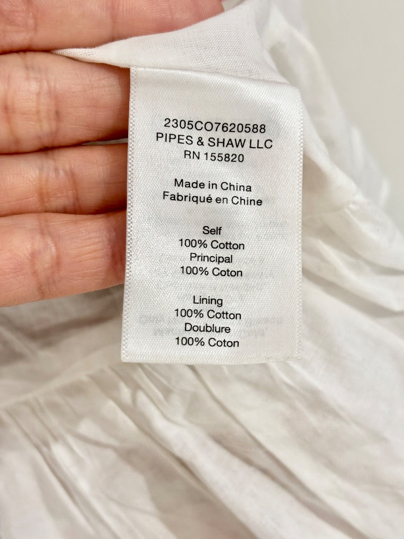 Adjustable and removable self-tie belt at the waist. Ruffle trim at skirt.