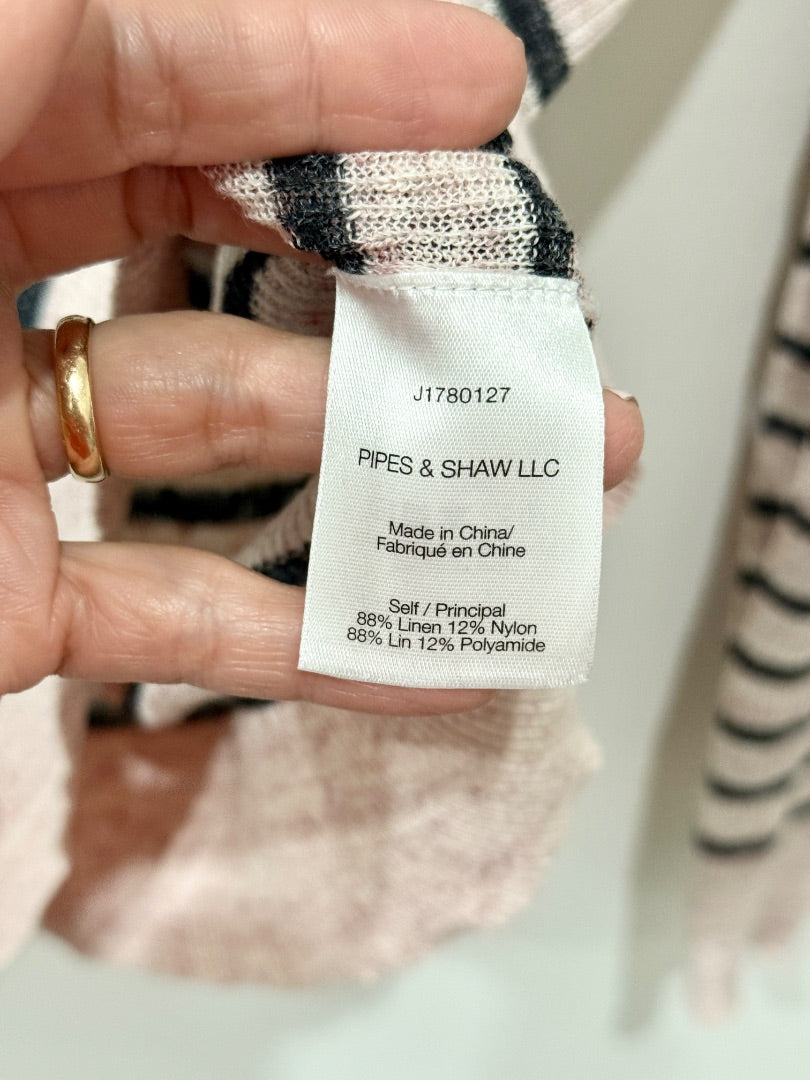 This lightweight linen-blend sweater features a pink and black striped pattern with a flattering V-neckline, offering a chic and casual layering piece.