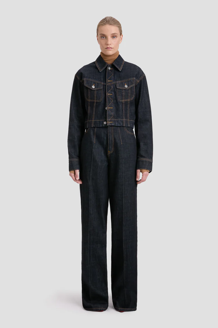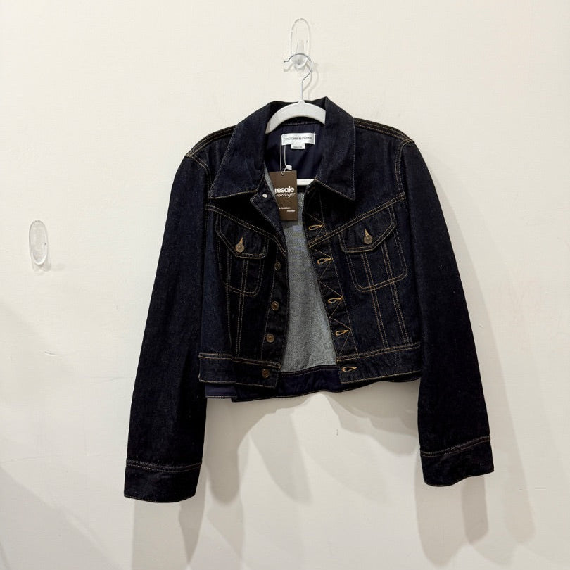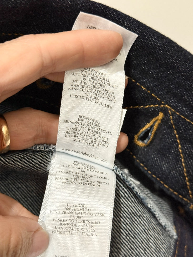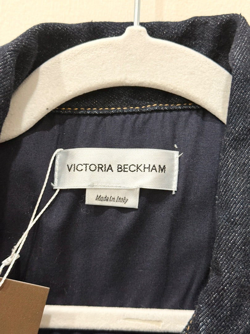 Crafted from premium denim, this jacket features a cropped silhouette, structured design, and refined detailing that reflects Victoria Beckham’s signature minimalist aesthetic.