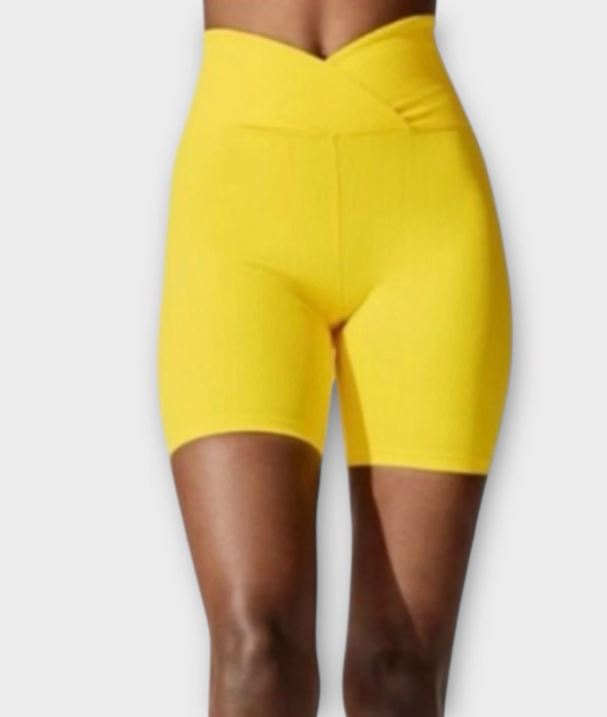 Ideal for yoga, cycling, gym workouts, or casual summer outings, these flattering high-waisted biker shorts offer both comfort and style with their vibrant color and supportive V-shaped waistband.