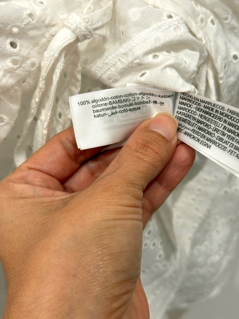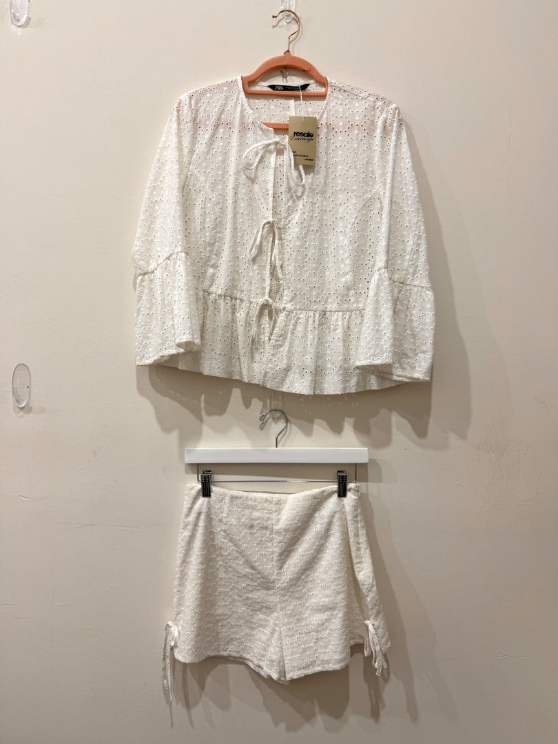 This fresh white set pairs an eyelet peplum blouse with coordinating flat-front shorts, creating a chic and breezy warm-weather look.