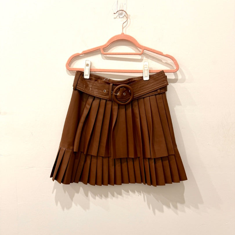 Zara Faux Leather High Waisted Belted Pleated Mini Skirt Brown Women's Size M