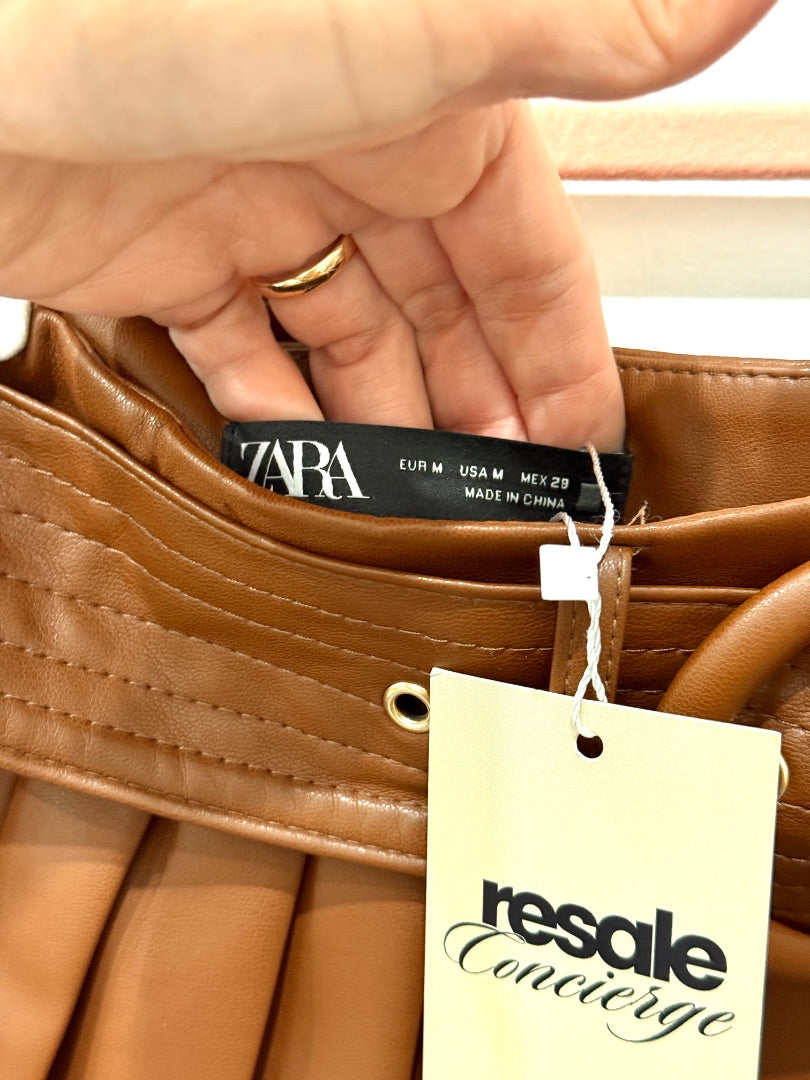 This Zara faux leather mini skirt features a high-waisted, belted design with pleated detailing in brown, offering a chic, edgy look perfect for day-to-night styling.